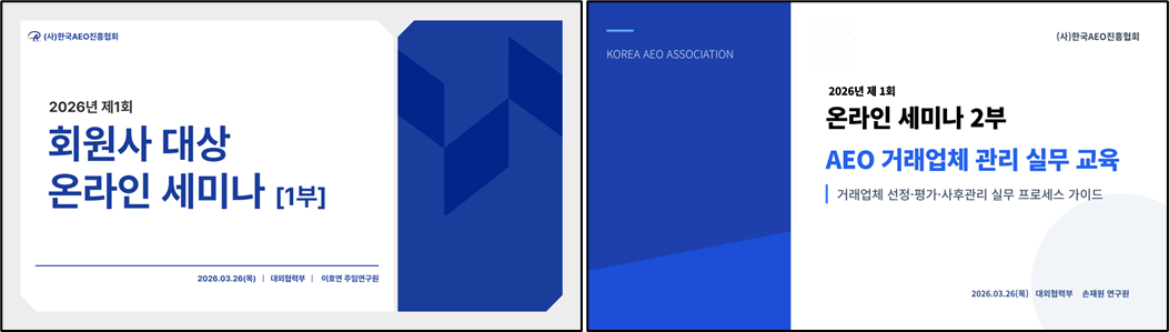 (사)한국AEO진흥협회(이하 ‘협회’)는 지난 3월 26일(목) 회원사를 대상으로 '2026년 제1회 온라인 세미나’를 성공적으로 개최하였다.